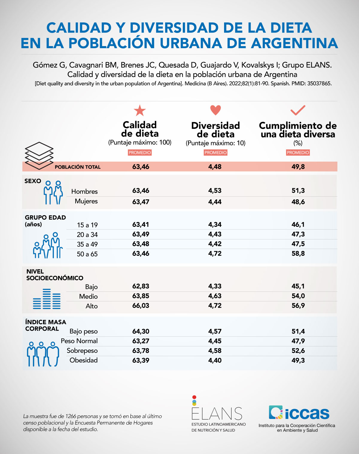 Según este estudio, Argentina presenta un índice de calidad de la dieta similar al de la mayoría de los otros países que participaron del estudio. En cambio, con relación a la diversidad de la dieta, nuestro país solo supera a Brasil, presentado un índice menor que el de Chile, Perú, Colombia, Ecuador, Venezuela y Costa Rica. Sin embargo, el índice de diversidad de la dieta para Argentina aumenta con la edad, así como el porcentaje de sujetos que tienen una dieta diversa, tal como sucede en el resto de los países estudiados.